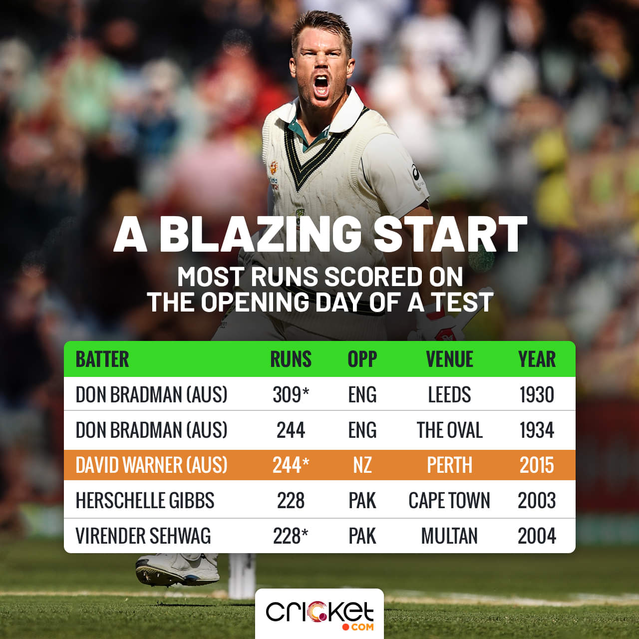 -Warner scored an unbeaten 244 against New Zealand on the opening day of the Perth Test in 2015, the joint-second-most runs scored by a batter on the first day of a Test match.