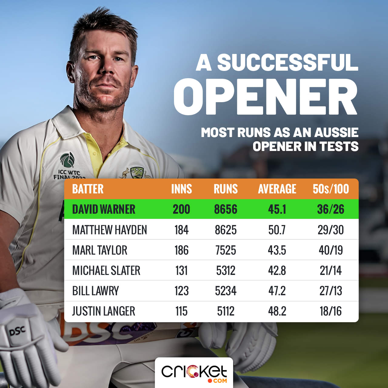 -With 8656 runs, Warner has the most runs as an Aussie opener. In the second Test against Pakistan on boxing day in Melbourne, he went Past Matthew Hayden's tally of 8625.