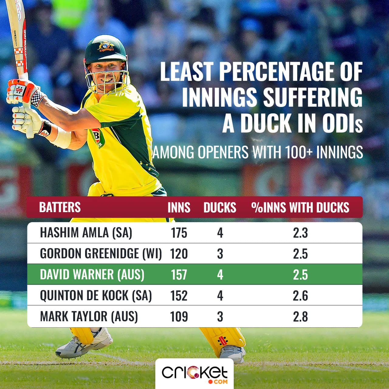 -In the 157 innings Warner has opened in ODIs, only four times has he been dismissed for a duck, the join-second-least. He has suffered a duck only 2.5% of the time in his ODI career as an opener, the joint second-least for an opener who has played 150+ innings.