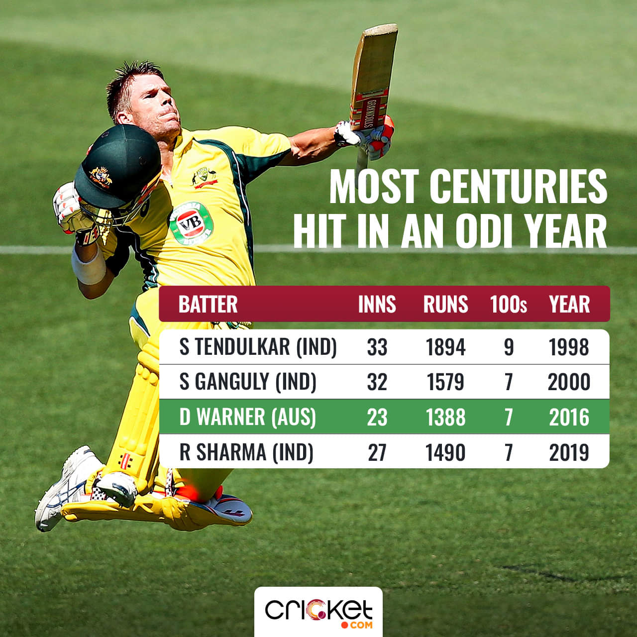 -In 2016, Warner scored 1388 runs at an average of 63.1, including seven 100s, the joint-second-most by any batter in a calendar year in ODIs.