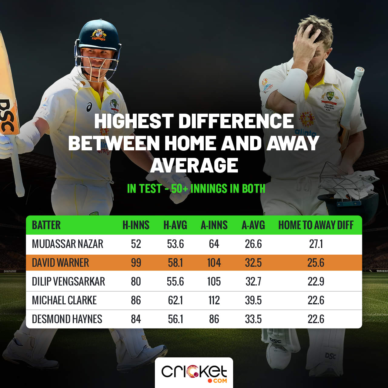 -Warner's average differs by 25.6 from home to away* (away includes neutral conditions). Among batters who have played 50+ innings in both home and away conditions, only Pakistan's Mudassar Nazar had a higher average difference.