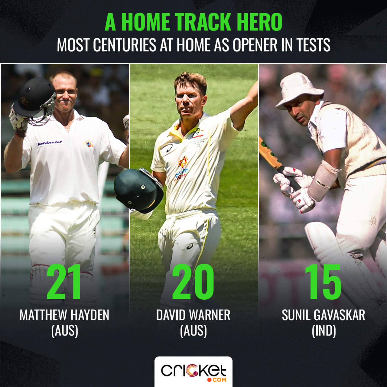 -Out of those 26 centuries scored by Warner, 20 have come in home conditions, the second-most for any opener at home. Hayden leads the list with 21. He could equal the record with one Test remaining or even go past Hayden if he scores two in two.