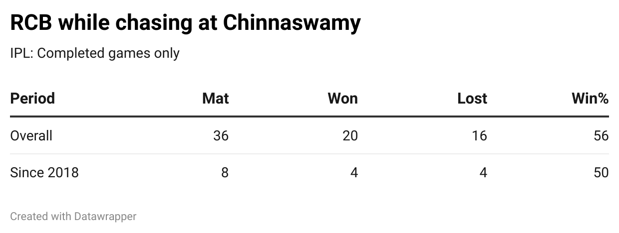 Of the 80 completed games RCB have played at their home venue, they have chased in 36 games (45%). But of these 36 games, they have won only 20 (55.5%). For context, RCB have won an equal number of matches batting first but over more games (20 out of 44: 45.4%). The percentage difference isn't big enough to call RCB a chasing side in the first place.