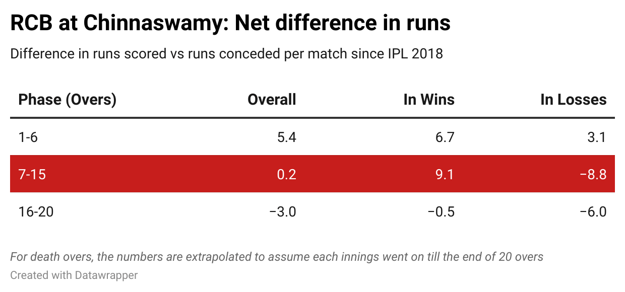 That leaves us with middle-overs. Across the 20 completed games, RCB bowlers and batters have negated each other out in overs 7-15, averaging 8.9 runs an over.