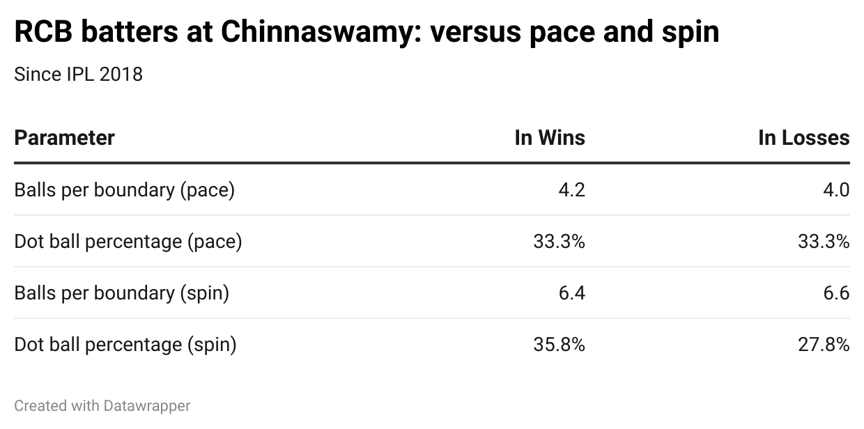 Let us lift the layers on this aspect as well. If we look at RCB batters against pace, they have hit a boundary every 4.2 balls in wins and every 4.0 balls in losses. So if anything they have gone marginally harder in tough games.