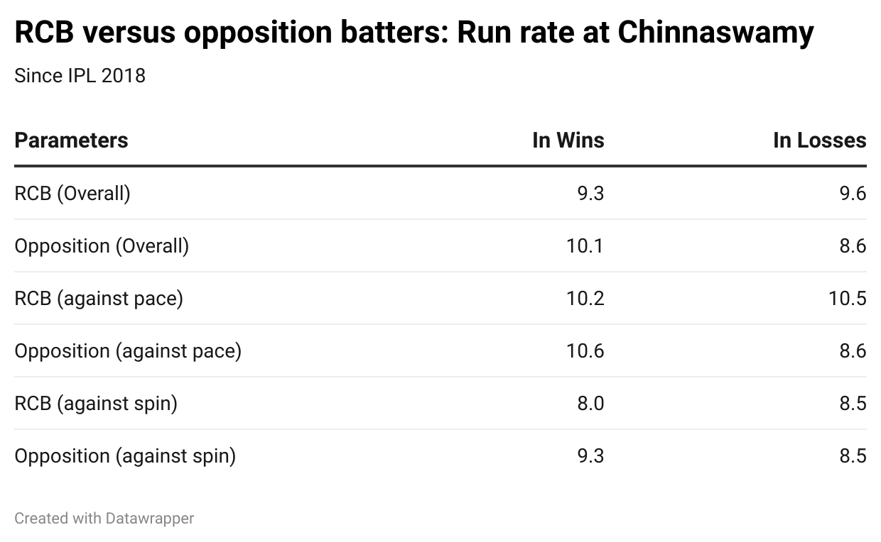 RCB have been poor at boundary-hitting home and away. In this period, RCB have a balls per boundary record of 5.9 overall across all venues. This is better than only one team, the one with the poorest win percentage in this period, Sunrisers Hyderabad (6.2). Despite boasting an enviable batting line-up, RCB have been unable to hit sufficient boundaries. And this has hurt them at their home ground.