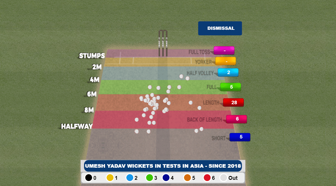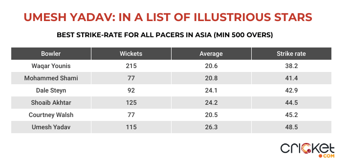 Only Shami has a better strike-rate (41.4) than Umesh (48.5), which is the second-best for all Indian pacers in Asia, with a minimum of 250+ overs. In India, the strike-rate falls lower to just 47.2, with an average of 25.2.
