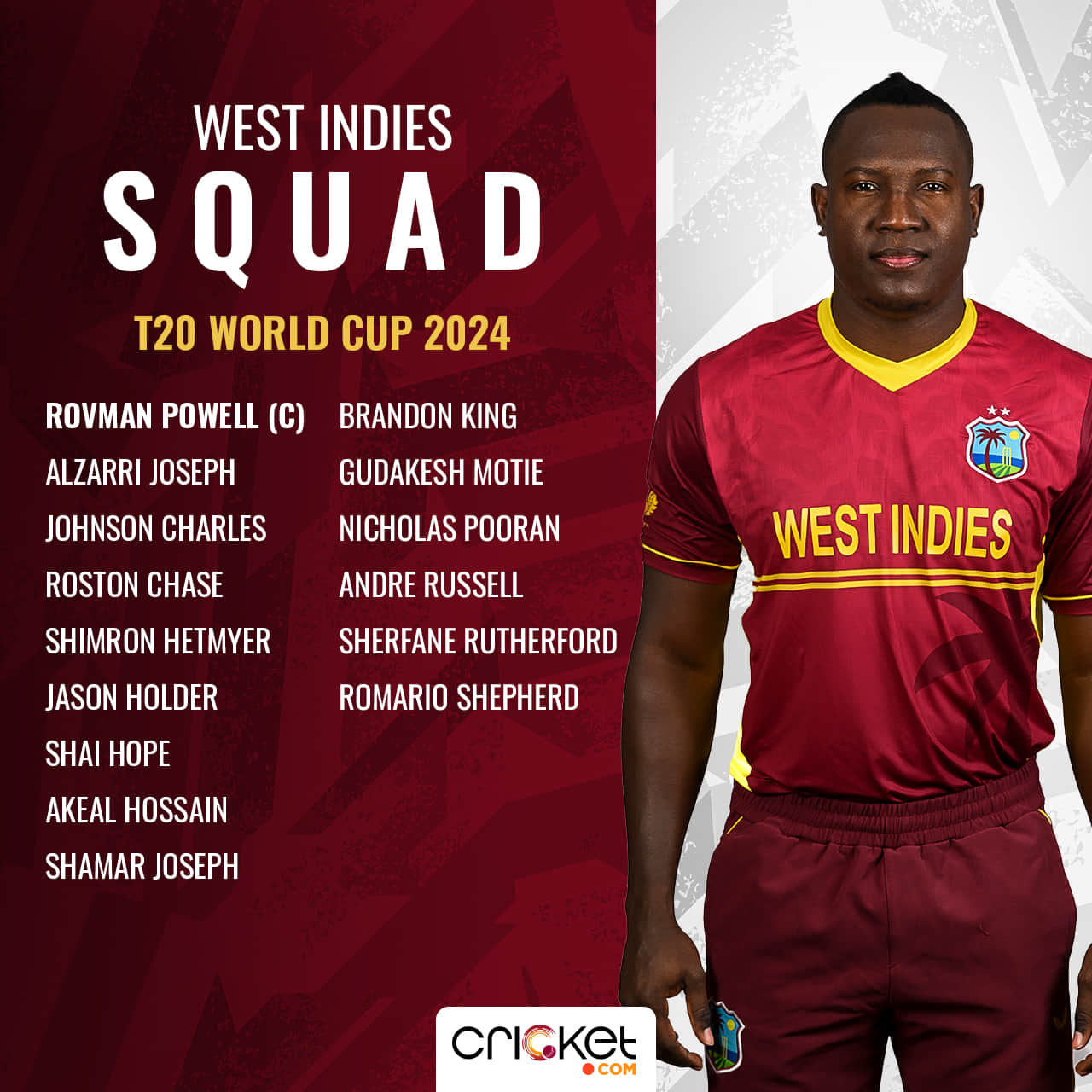 Squad: Rovman Powell (c), Alzarri Joseph, Johnson Charles, Roston Chase, Shimron Hetmyer, Jason Holder, Shai Hope, Akeal Hossain, Shamar Joseph, Brandon King, Gudakesh Motie, Nicholas Pooran, Andre Russell, Sherfane Rutherford, Romario Shepherd