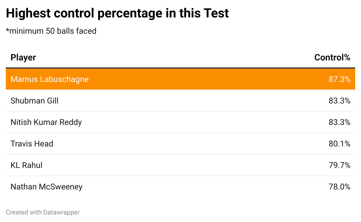 Knowing what to leave and what to play meant that the right-hander showed impeccable control. Labuschagne finished the innings with a control percentage of 87.3%, by some distance the highest among all batters.