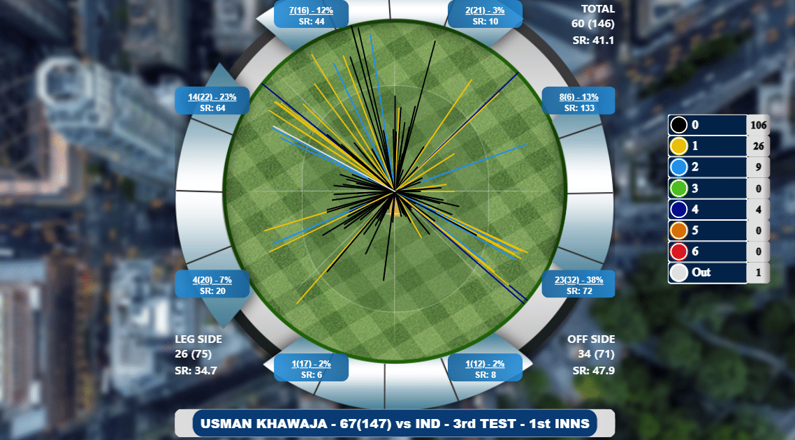 Unlike the Delhi Test, in which Aussie batters employed sweeps and reverse sweeps with alacrity, in Indore, Khawaja was determined to take the ball and decide the course of the shot. Neither did he panic, nor did he unnecessarily sweep. With Ashwin going for a defensive bowling strategy, Khawaja found scoring runs on the leg side easy, ending up with a virtuoso performance. So perfect was his placements today that he had played 75 balls on the leg side, and 71 balls on the off-side, collecting 26 and 34 runs respectively. A remarkable facet of his batting indeed.