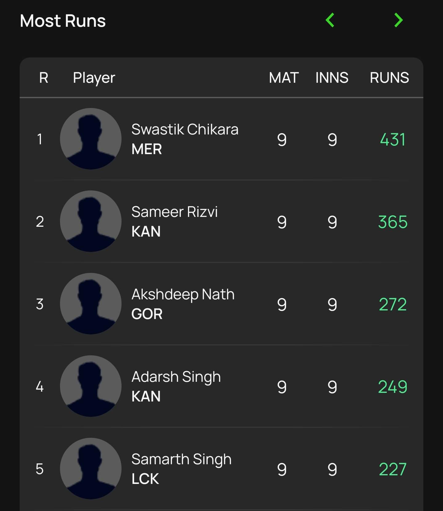 While Chikara leapfrogged Rizvi (431) with a stunning century against Gorakhpur Lions, the Chennai Super Kings player isn’t too far behind, with 365 runs in nine innings. And then, after a huge gap, there’s the Superstars’ Adarsh Singh in third position with 249 runs in the season.
