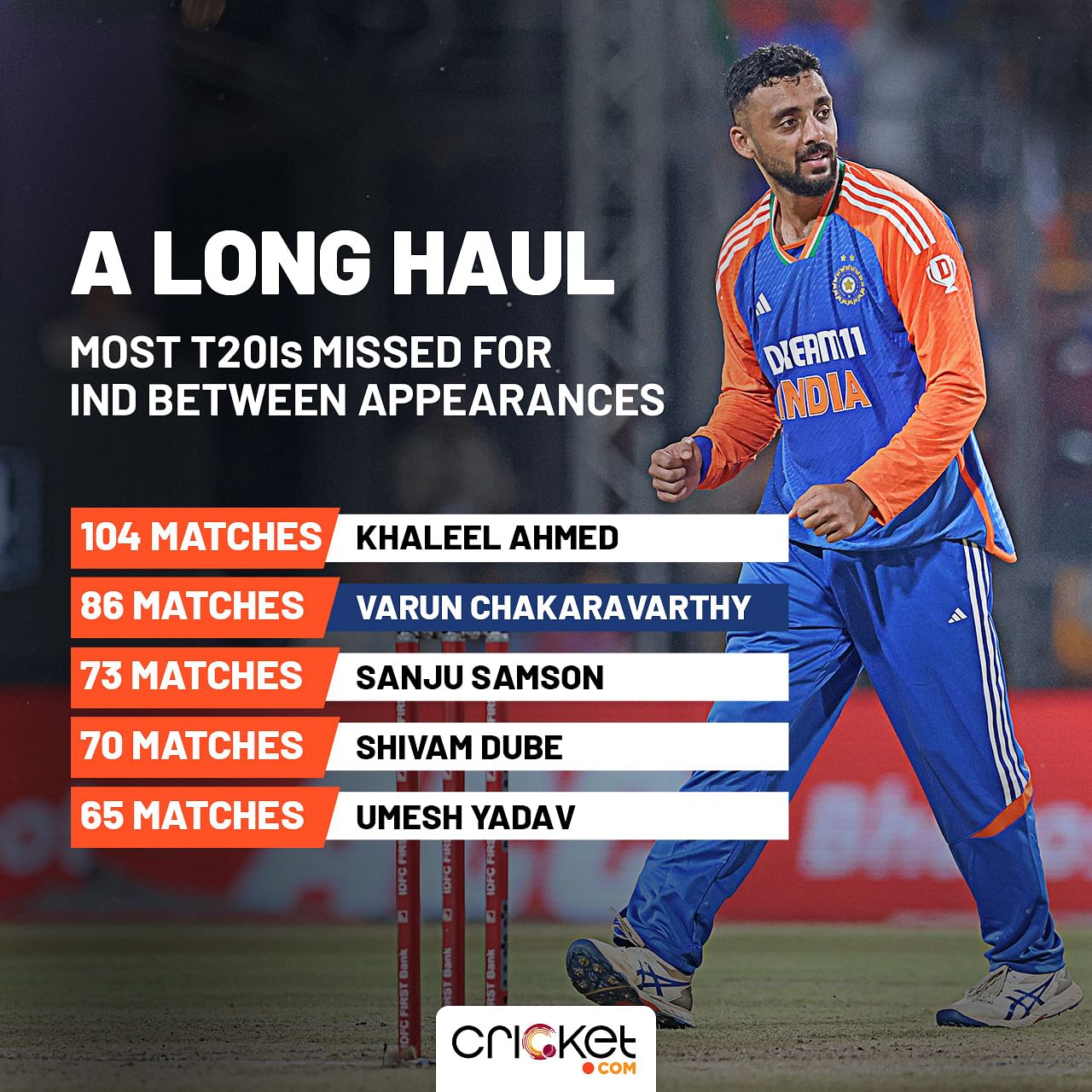 The right-arm mystery spinner played six T20Is for India in 2021. However, following India’s dismal performance in the 2021 T20 World Cup (first round exit), Varun was overlooked. He missed 86 T20Is for India in between, the second most for India between appearances.