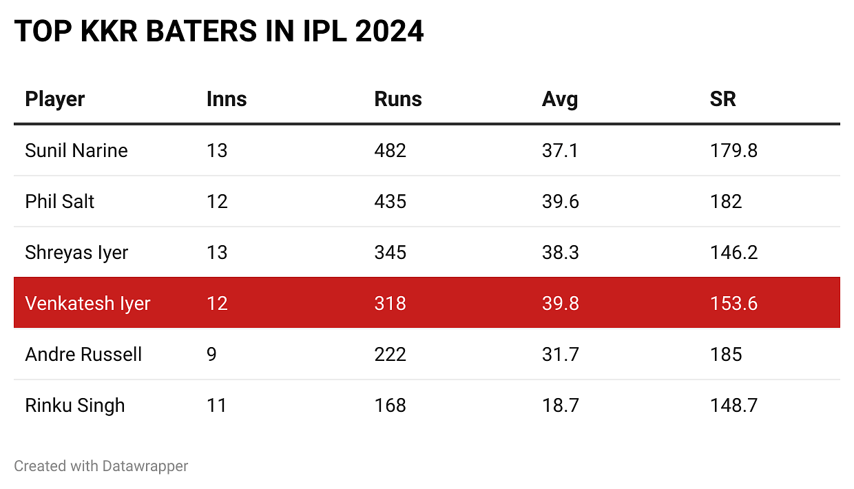 In terms of runs, he is Kolkata Knight Riders’ fourth-highest run-scorer, scoring 318 runs at an average of 39.8 while striking at 153.6. Shreyas Iyer has scored more runs (345), but Venkatesh is far ahead in terms of impact.
