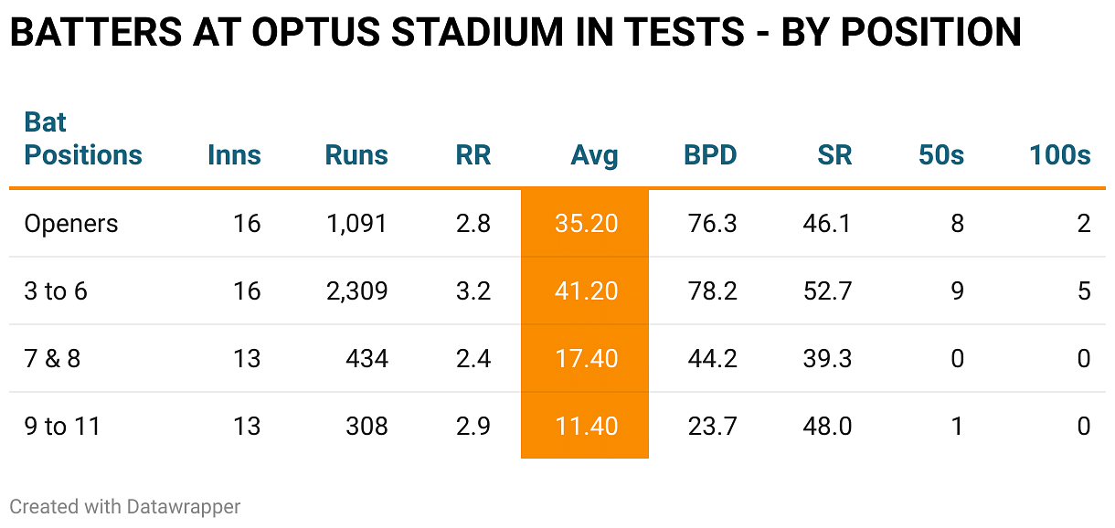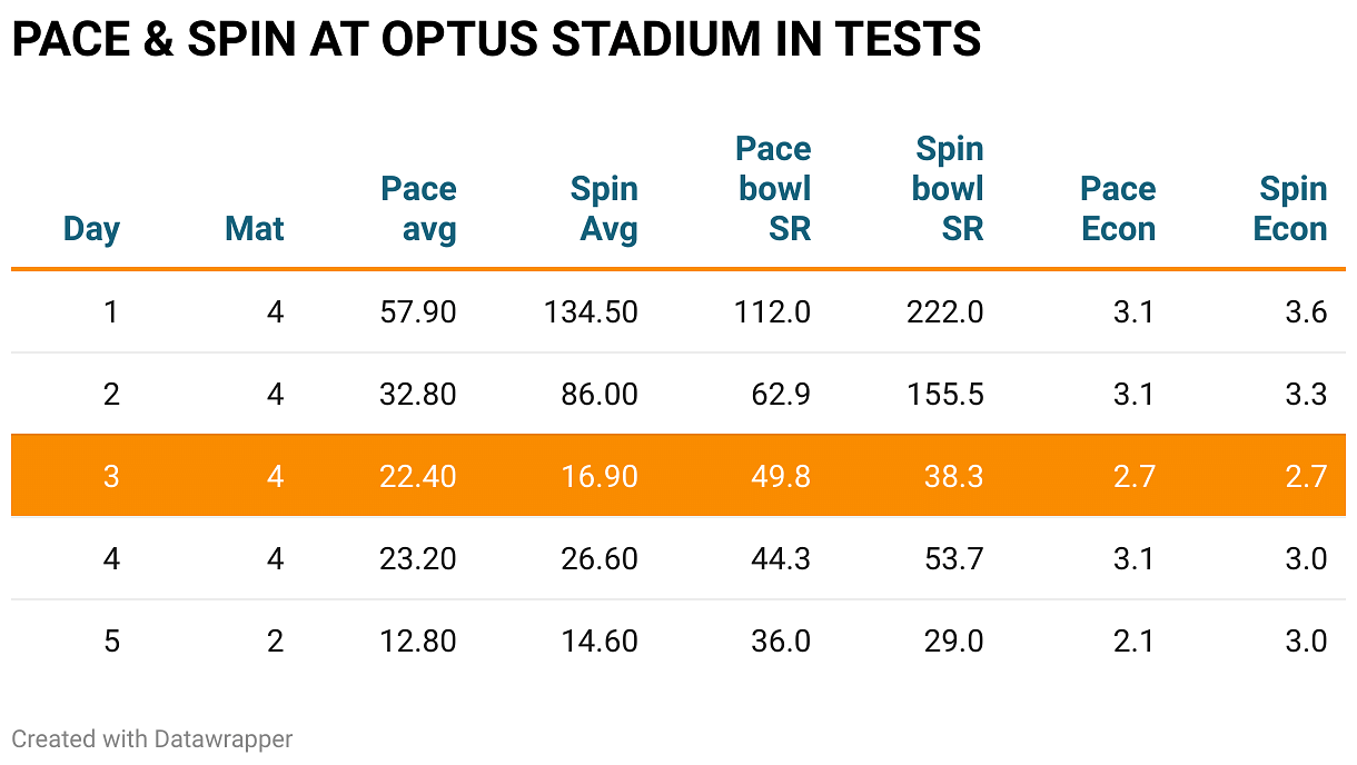 It's Day 3, however, where the major movement of matches have happened, with bowlers dominating proceedings at an average of 20 and SR of 47. Bowlers have continued to have the upper hand on the fourth day. Day five at the Optus Stadium, in general, has proven to be a mere formality with the major chunk of the wickets being tail enders.