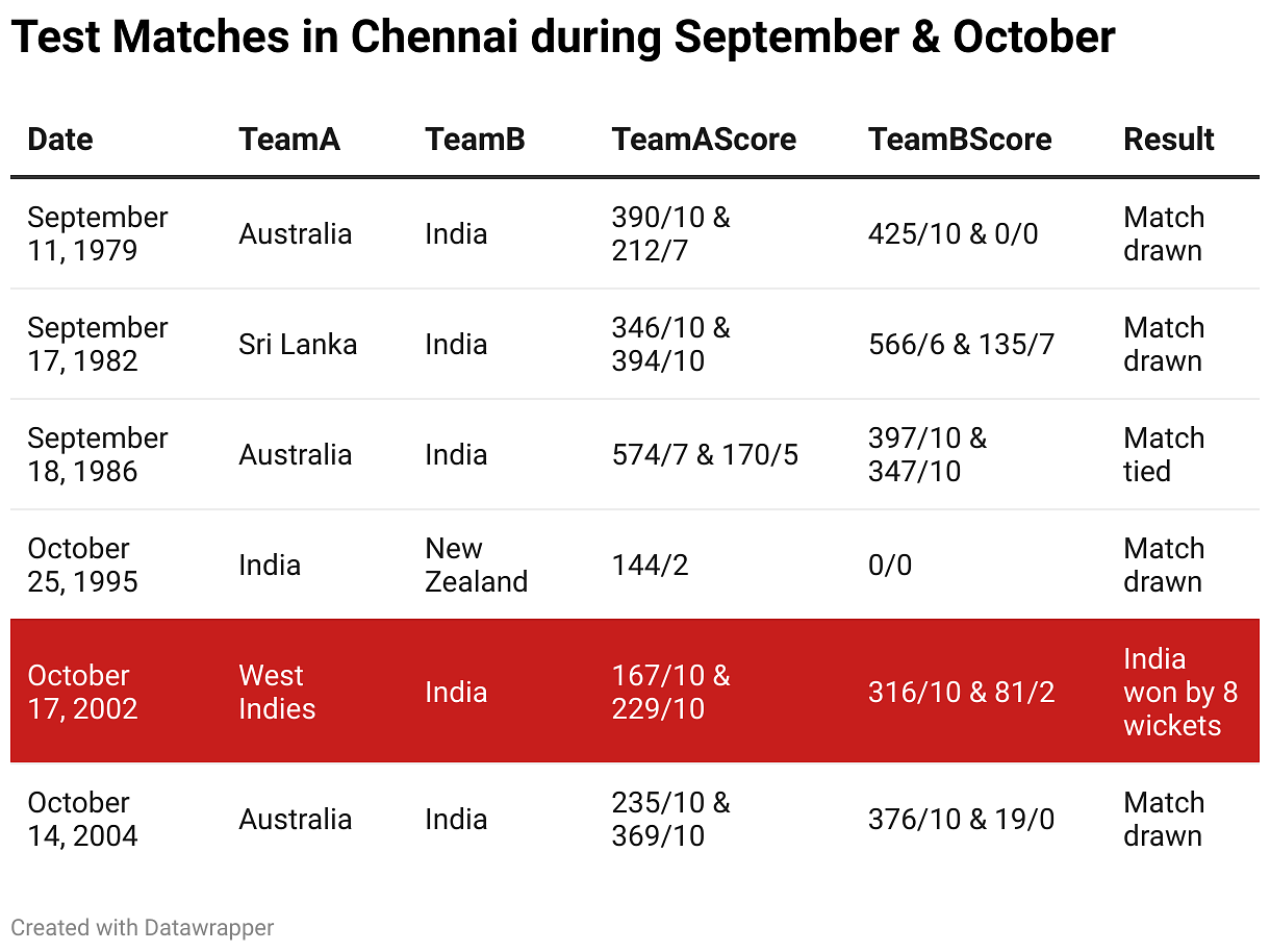 With monsoon season around the months of September and October, Chennai has not hosted many Test matches during this time. Out of 34 Tests at this venue, only five Tests were held during these two months. The last time a Test was held in September was 38 years ago, back in 1986, which saw the second-ever tied Test match between India and Australia.