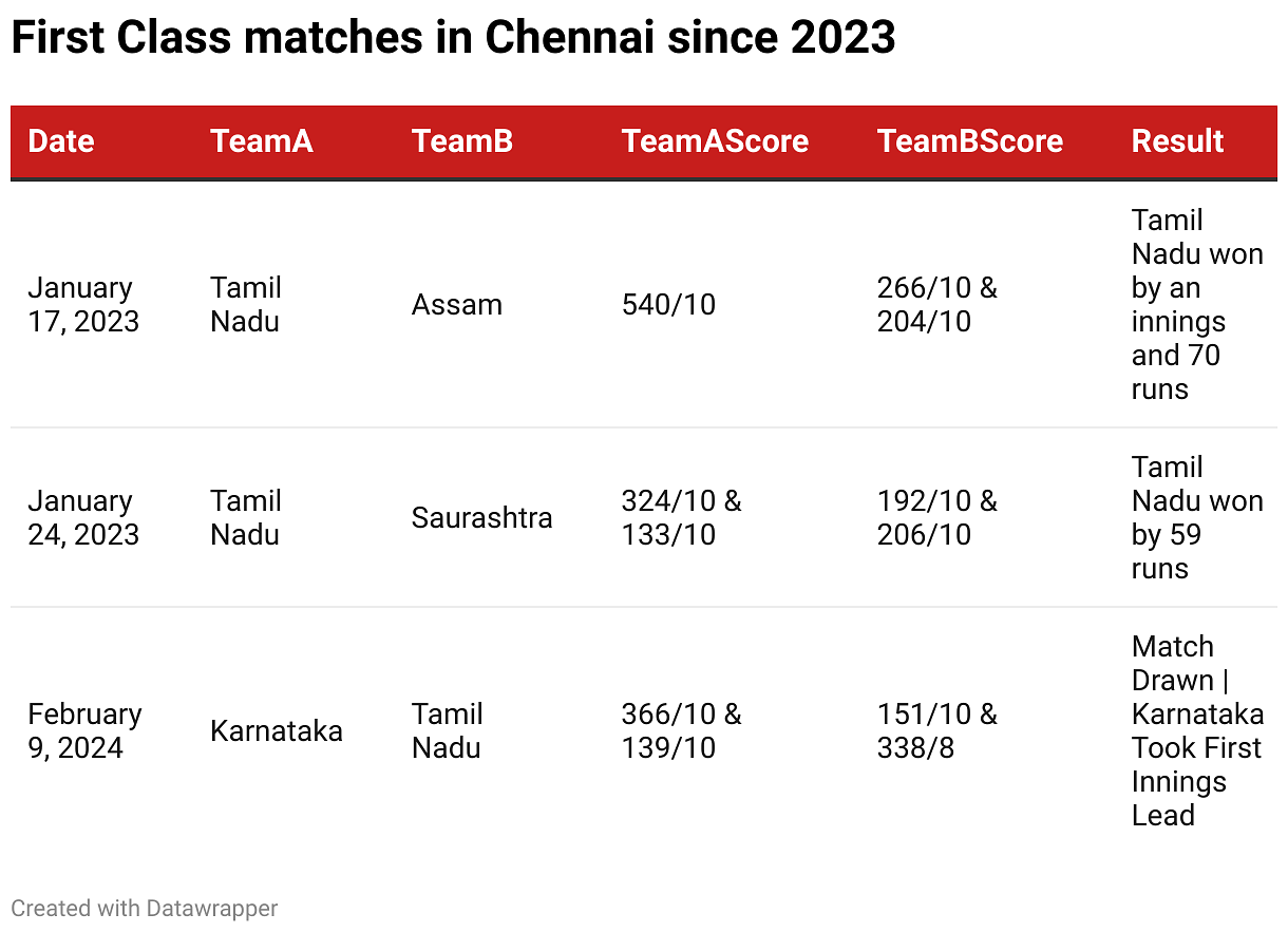 Since 2023, Tamil Nadu have played three Ranji Trophy games during the 2022-23 season. Tamil Nadu won two of those games against Saurashtra and Assam, respectively, and their third match ended in a draw, with Karnataka taking the first-innings lead. In all these three matches, teams scored in excess of 300 runs. In the remaining three innings, only once a team scored 300+ runs.