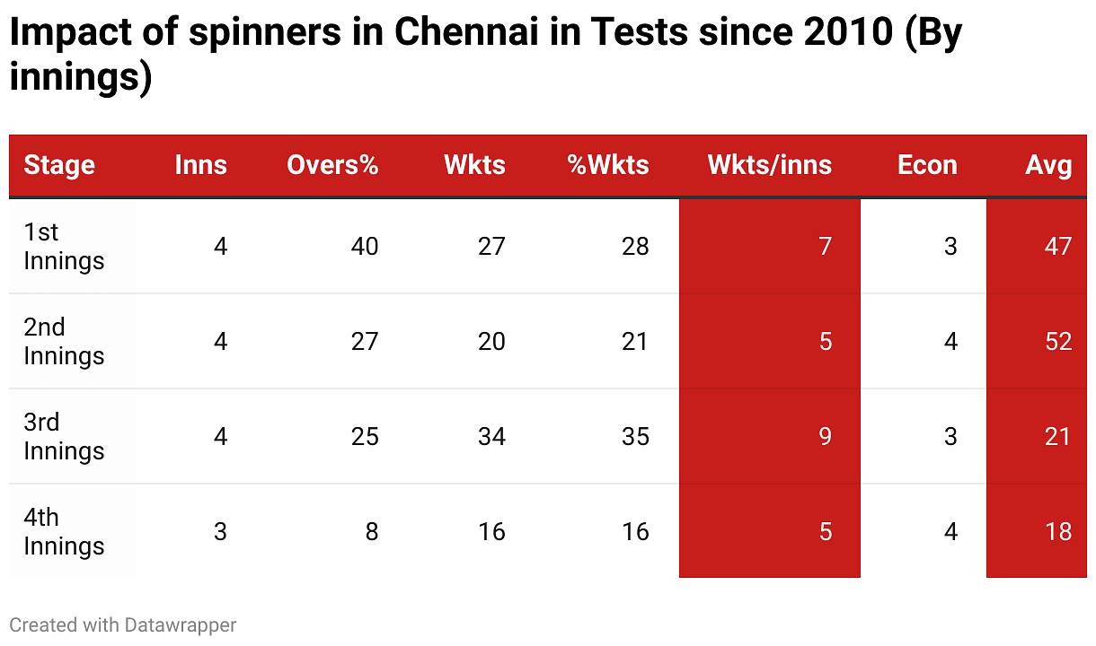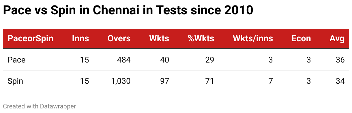 Chennai is one of the favourite venues for spinners in Tests. Since 2010, nearly 71% of wickets have been taken by spinners, with an average of seven wickets per innings. Pacers, too, have done a decent job at this venue, as their bowling average is almost the same as spinners.