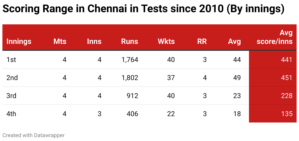 Like many pitches in India, Chennai is the best for batters during their respective first innings, as the average scores are around 450. This completely drops in the second innings as the ball makes a lot of noise when it is in the hands of the spinners. The average drops to nearly 200 runs per innings, which makes it clear that the first-innings lead plays a vital part in winning a Test, as it is tough for teams to bounce back from a deficit.