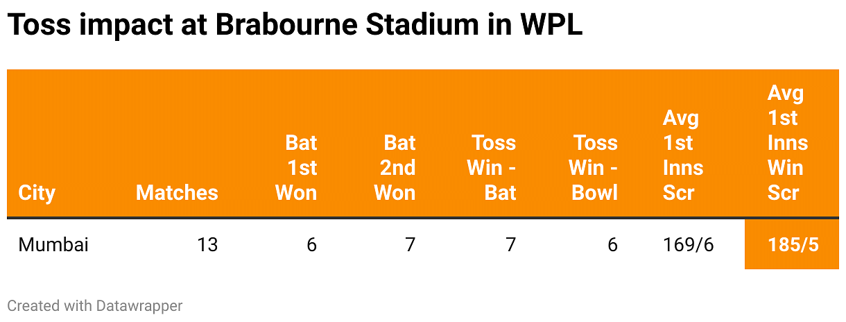 The toss has not been a major factor like the other venues in Bengaluru and Vadodara, where teams chasing won more than 80% of the games. In the 13 WPL games played at this venue so far, the toss has been almost 50:50, with six instances of teams winning batting first and seven instances while chasing. The average first-innings winning score of 185 tells us that teams must score big in order to win games at this venue.