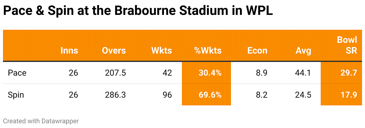 Spinners have dominated at the Brabourne Stadium, taking nearly 70% of the wickets and striking at 17.9, almost half the pacers' strike rate of 29.7. The bowling average of 24.5 shows how tight the spinners are when it comes to conceding runs at this venue.