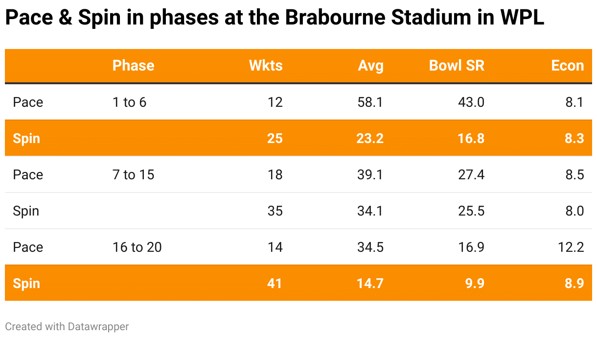 The middle overs phase is even-steven as both pace and spin operate at the same rate. Spinners once again have overpowered pacers in the slog overs (16-20), striking at a terrific rate of 9.9 and averaging 14.7, showing how going spin-heavy might be a winning formula.