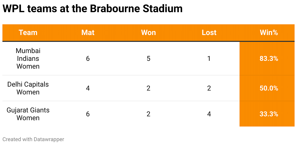Among the three teams in the playoffs, it's the home team, Mumbai Indians, who have a terrific record at this venue, winning five of their six games and lifting the trophy as inaugural champions in 2023 at this venue. Gujarat Giants' only two wins in the 2023 season came at this venue.