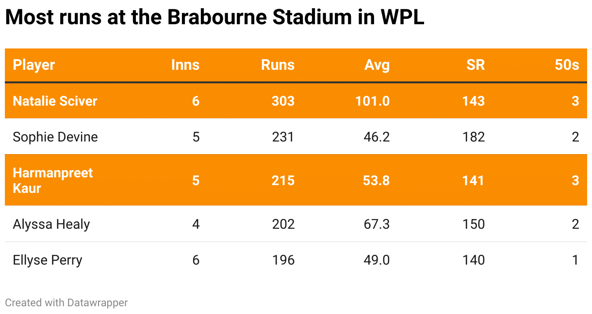 Nat Sciver-Brunt has been the best batter at this venue, scoring 303 runs at a terrific SR of 143. She has three 50s and has gotten out only thrice in six innings at this venue, averaging 101. MI skipper Harmanpreet Kaur, too, has been spectacular at this venue, scoring 215 runs at an excellent SR of 141, maintaining a good average of 53.8 with three fifties.