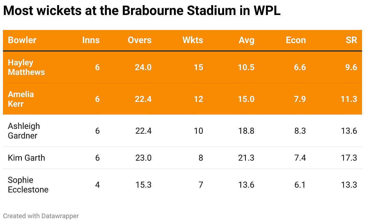 MI's spin duo of Hayley Matthews and Amelia Kerr are the best bowlers at this venue, with 15 and 12 wickets each at an excellent bowling SR of 9.6 and 11.3, respectively. Kerr has been a tad expensive at 7.9 compared to Matthews, who has been economical at 6.6.