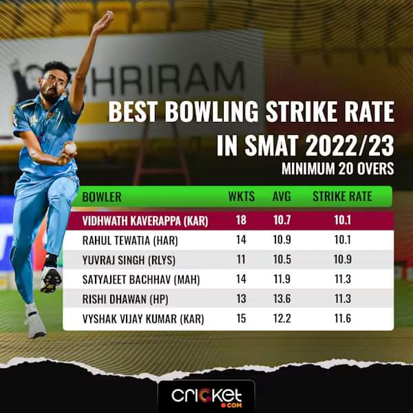 With the red ball, he rose to prominence, with 80 wickets in 20 first-class games, where he averaged just 20.08. But the rise didn’t stop there, with his display in the 2022/23 Syed Mushtaq Ali Trophy (SMAT), where he picked up 18 wickets, the joint-most for any Karnataka bowler in their debut season.