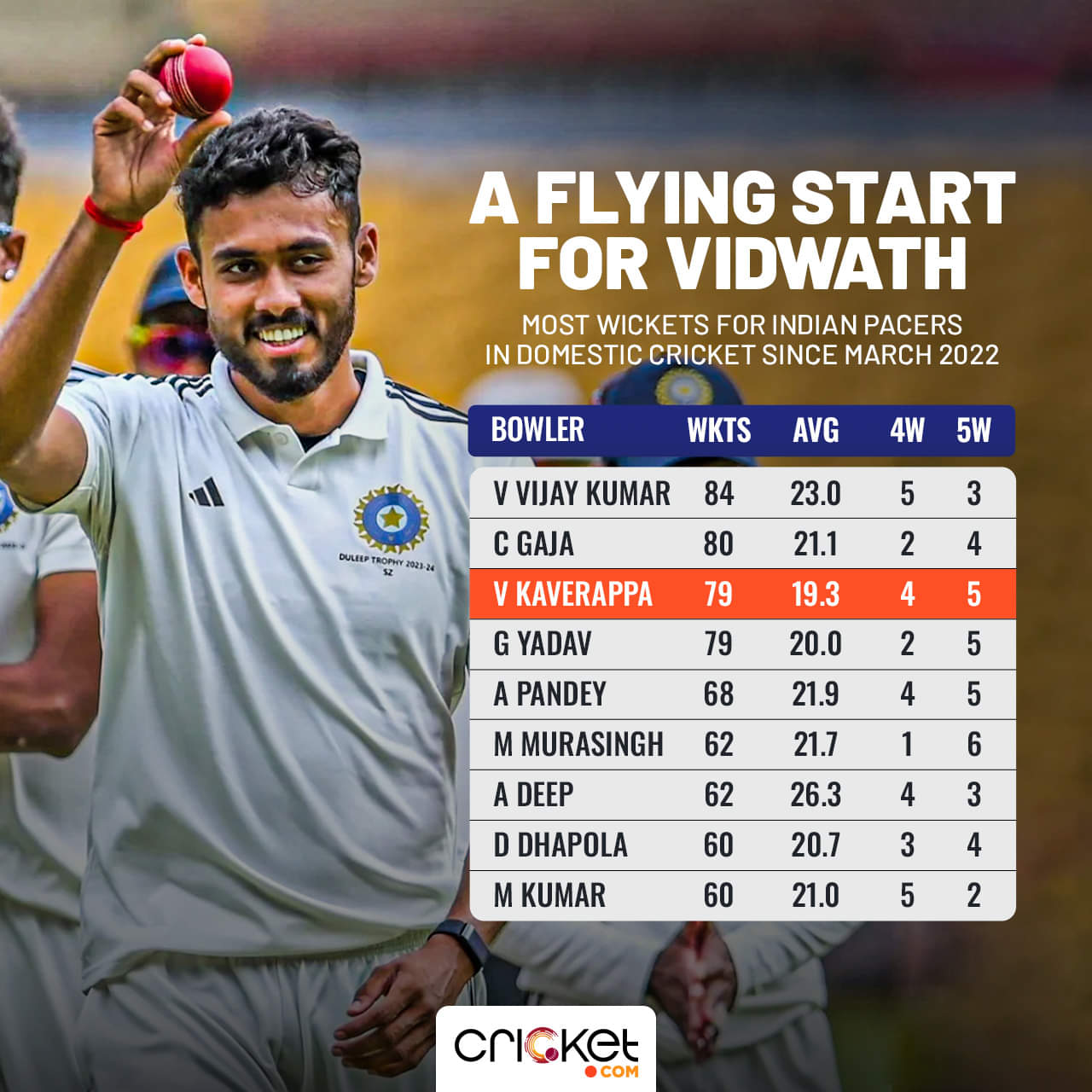 In his first full season with Karnataka (2023), the 25-year-old pacer picked up 38 wickets, averaging just 17.1. But in comparison, the second-season syndrome got to him, with 27 wickets, averaging 21.4, a touch more than he did in his first full season.
