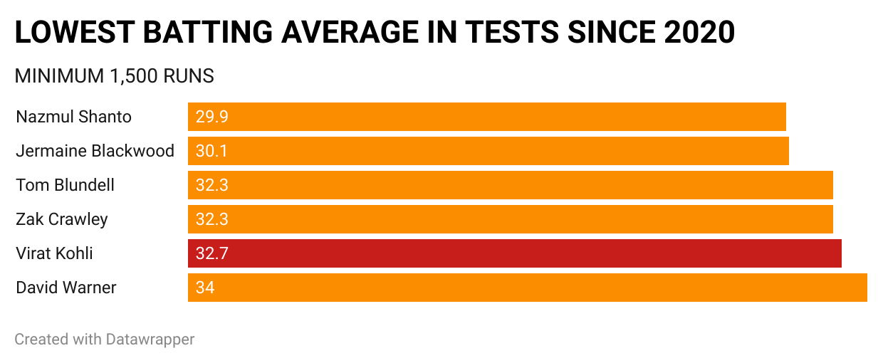 In 33 Tests since 2020, Kohli averages 32.7 for his 1,833 runs. It is the fifth-lowest average for any batter in this span, with a minimum of 1,500 runs. The batters below him include Jermaine Blackwood, who hasn’t played for West Indies in over a year, Tom Blundell, a wicketkeeper batting lower down the order, and Zak Crawley, whose low average can be compensated for achieving a Bazball-esque strike rate in the 60s.