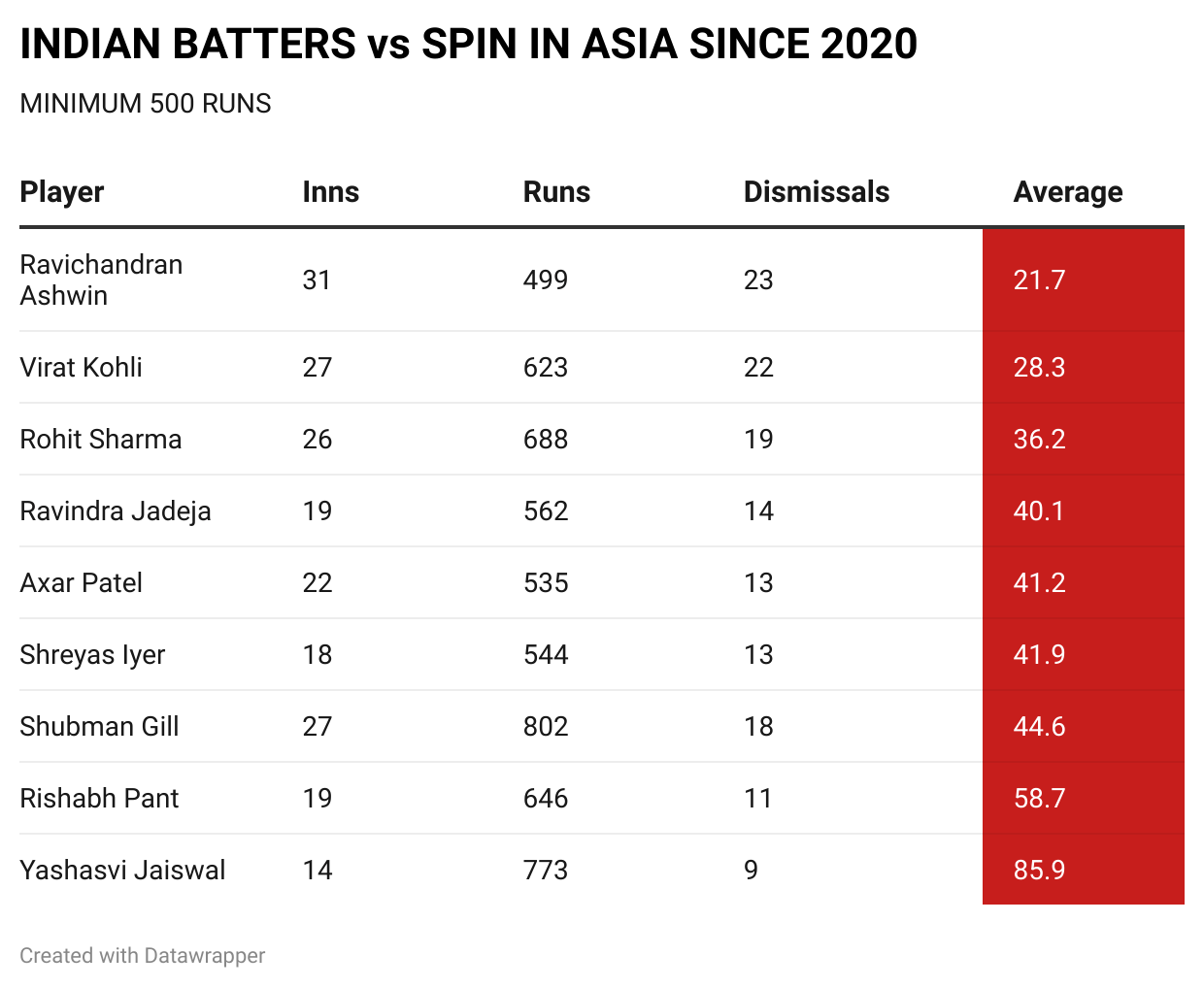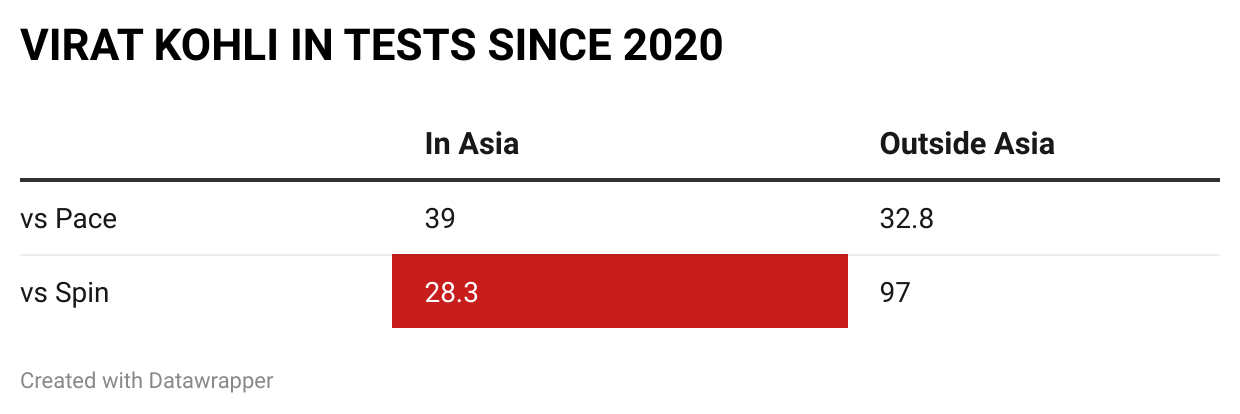 Meanwhile, his average against spin in Asia is the lowest number in the above table, which involves two Tests in Bangladesh and 15 in India.