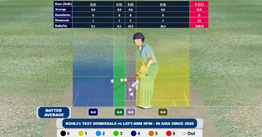 Against left-arm spin, Kohli gets tied down on the back foot, falling seven times (again) — four lbws, three bowleds. As expected, there is a cluster of balls in line with the stumps, troubling him by either going straight or turning sharply across him.