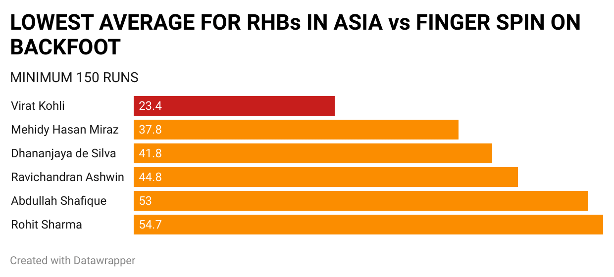 In fact, overall, Kohli has the lowest average against finger-spin on the back foot in Asia in these five years. Furthermore, the difference between Kohli and Mehidy Hasan Miraz is alarming.