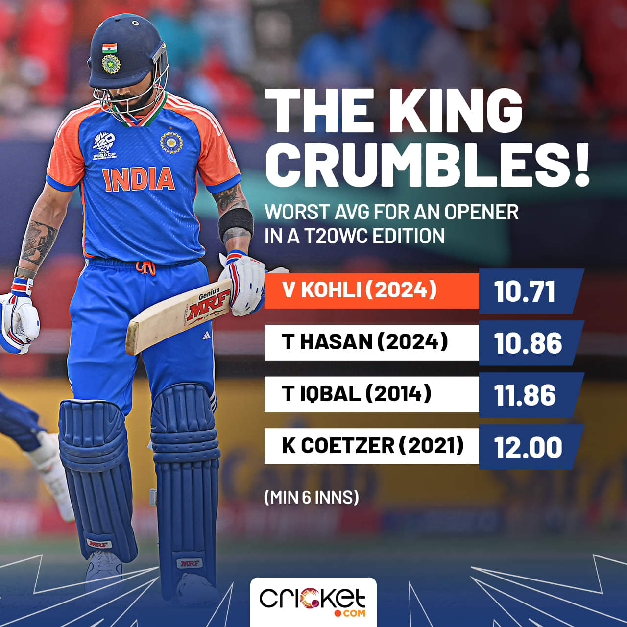 Kohli came into this tournament on the back of a stunning IPL 2024. He was the leading run-scorer in the competition, amassing 741 runs across 15 innings at an outstanding average of 61.75. However, in this T20WC, all Kohli has managed are scores of 9, 0, 37, 24, 0, 4 and 1.