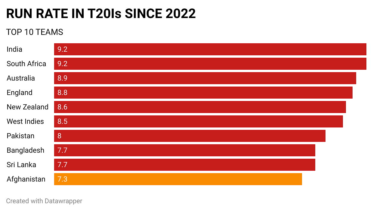 After the defeat in Mohali, Afghanistan skipper Ibrahim Zadran stated they were 13-15 runs short. Since 2022, Afghanistan have the lowest run rate in T20Is - 7.3.