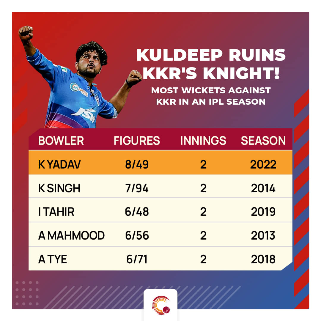 Not only in this match, in the reverse fixture against Kolkata, Kuldeep was the star with the ball. In his other fixture, he bagged four wickets for 35 runs in his full quota of overs. In this fixture, he bettered it as he bagged four for 14 runs in three overs. In the IPL, the eight wickets picked up by Kuldeep in two fixtures against Kolkata is the most for a bowler in a season of IPL against Kolkata.