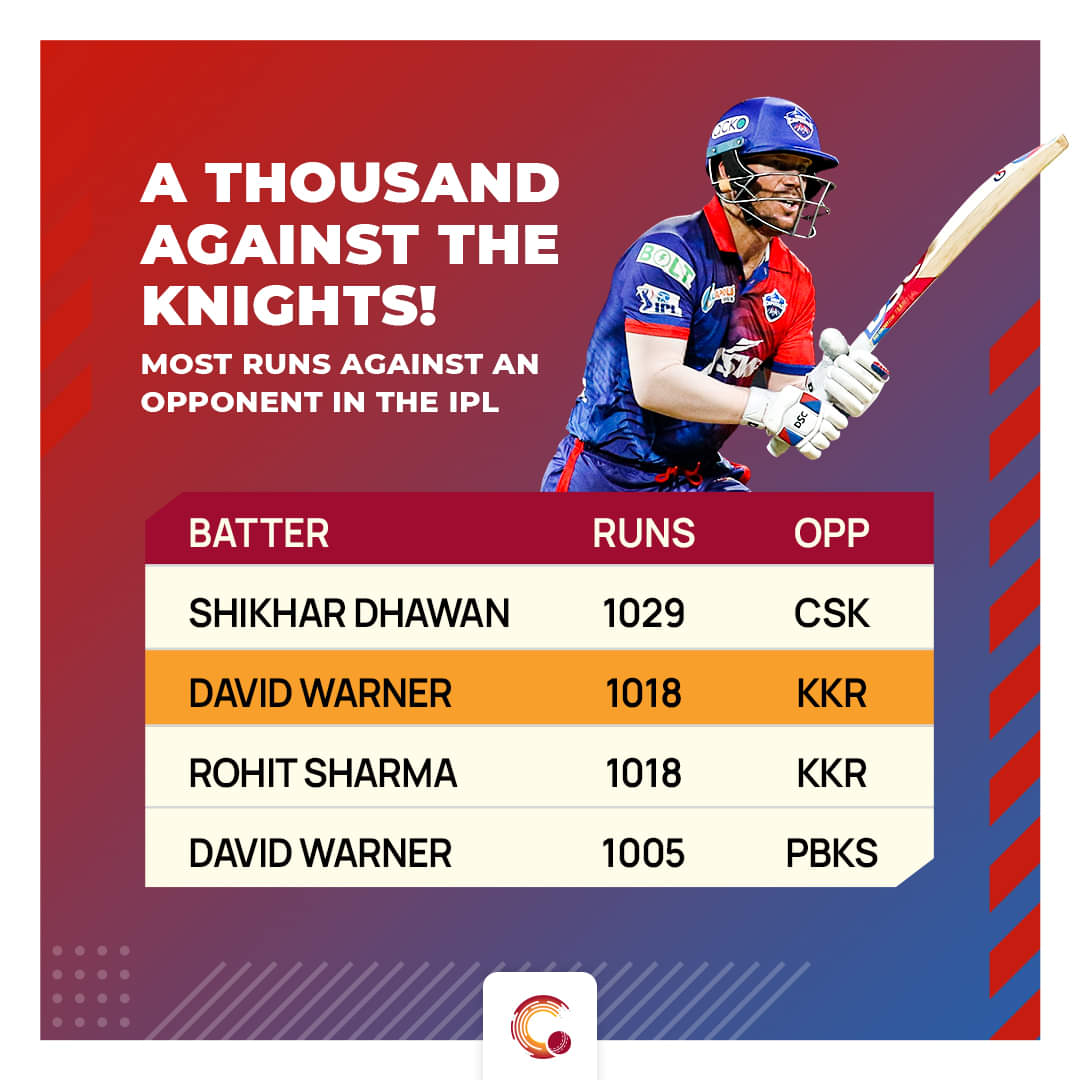 If that is not enough to justify, here is another one. En route his knock of 42 against Kolkata, Warner reached the 1000-run mark against the Kolkata franchise. This is the second franchise against whom he has scored 1000+ runs, making him the only batter to score 1000+ runs against two opponents in the IPL. He has scored 1005 runs against Punjab Kings with 12 scores of 50.