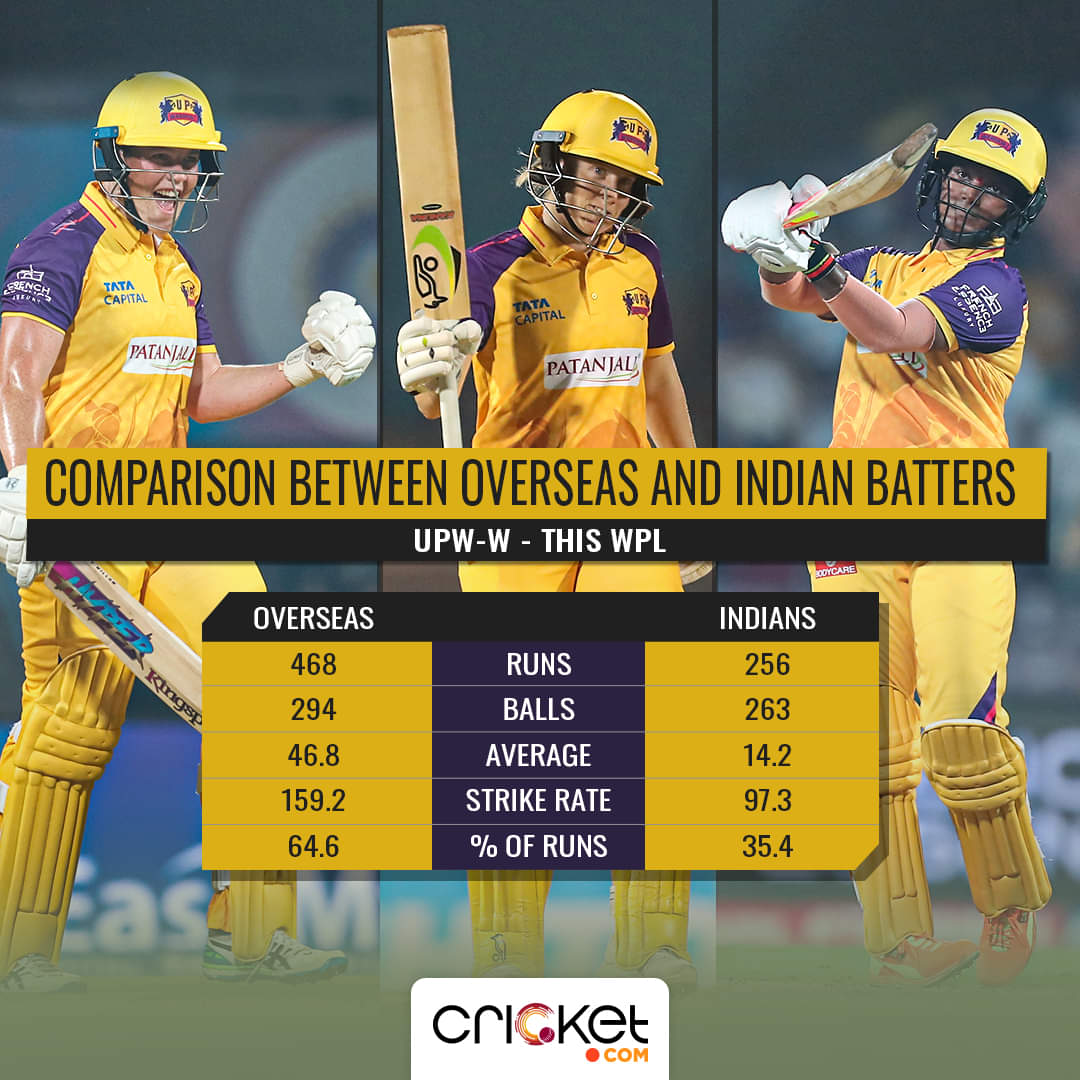 Overall, Indian batters have 256 runs at an average of 14.2 and a strike rate of 97.3. In comparison, the four overseas batters have scored 456 runs at an average of 46.8 and a staggering strike rate of 159.2. That’s massive underperformance from the Indian contingent. Out of the 724 runs scored by UP batters (excluding extras), the overseas batters have scored 64.6 percent of the runs.
