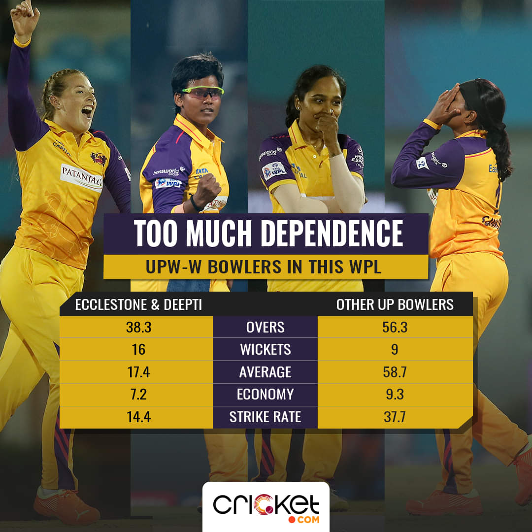 Overall, Ecclestone and Deepti together, have bagged 16 wickets at an average of 17.4 and a strike rate of 14.4. These two have conceded at an economy of 7.2. The other bowlers have bagged nine wickets at an average of 58.7, a strike rate of 37.7, and economy of 9.3.