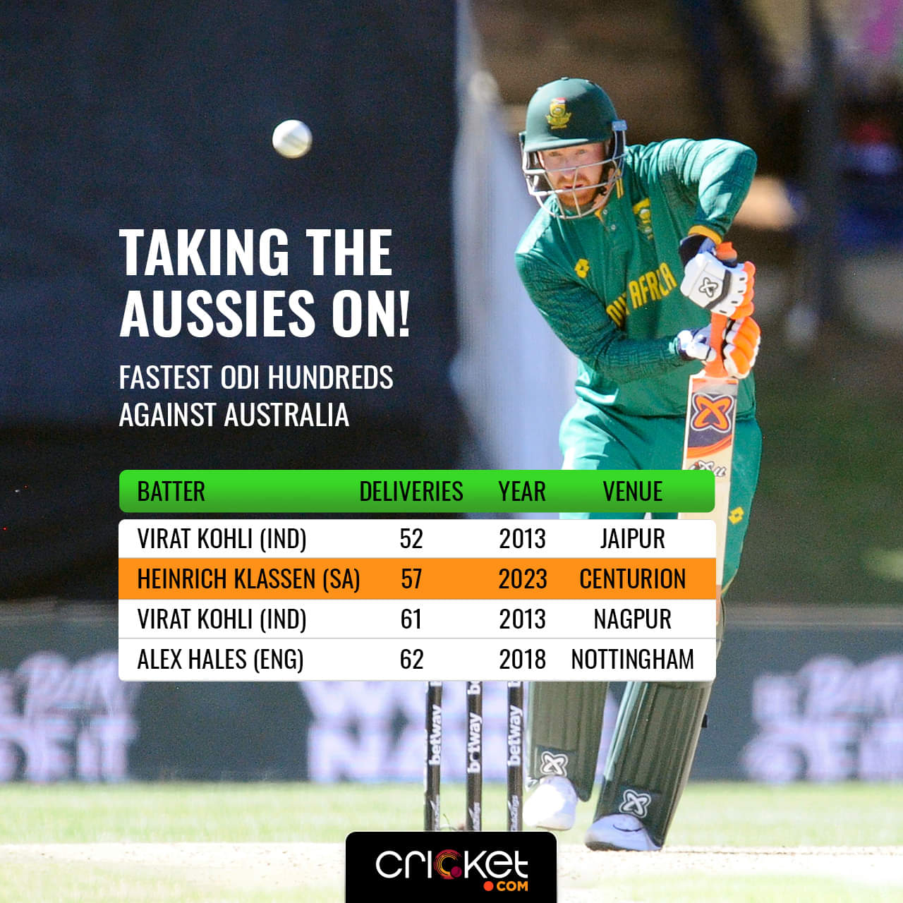 He was extremely ruthless against Zampa. He only faced 17 deliveries from the legspinner and smashed him for 50 runs, including six maximums and two fours. Even against Marcus Stoinis, Klaasen got 45 off 20 deliveries, getting three fours and four sixes. From 24 off 25, Klaasen moved to 51 off 36 before completing his third century off just 57 deliveries, the second-fastest against Australia after Virat Kohli’s 52-ball ton in 2013.