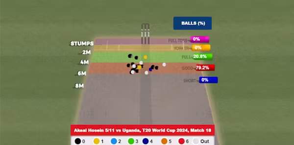 Hosein’s strongest suit has been to bowl at a length, and it was evident in the clash against Uganda, where he finished with figures of 5/11. Nearly 80% of his deliveries on the day were on that length, which troubled the Ugandan batters.