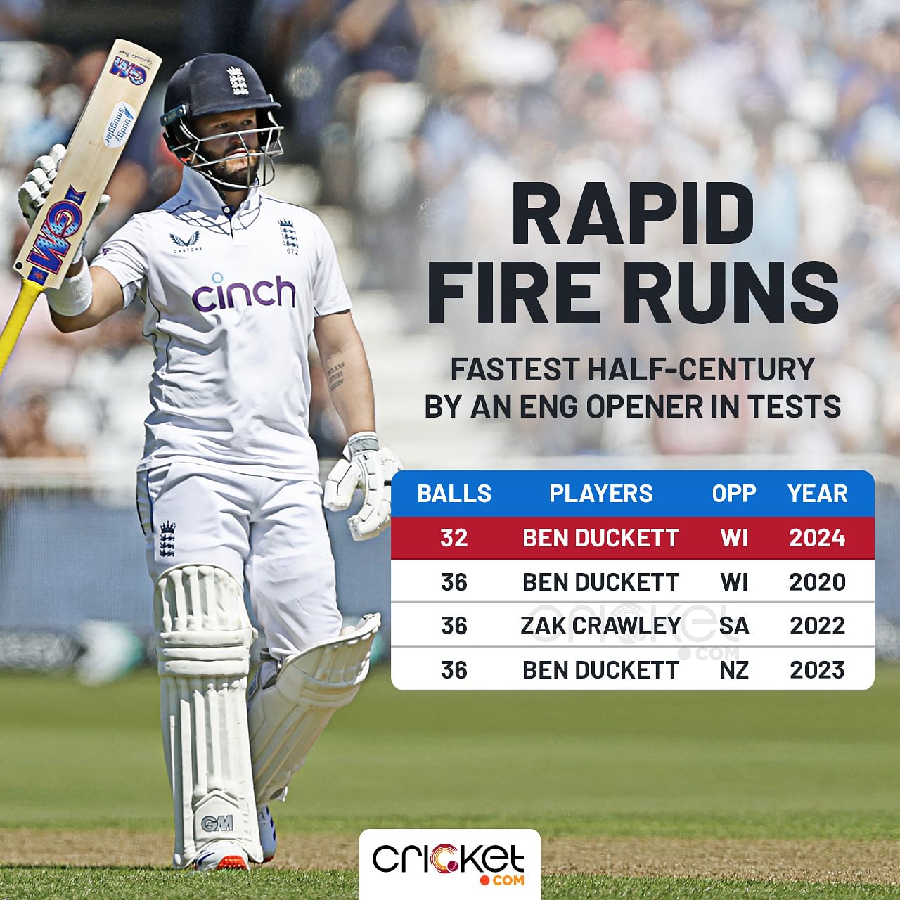 The left-hander eventually reached his fifty in only 32 balls, scoring the fastest Test fifty by an England opener. He was out minutes before Lunch for 71 from 59 balls.