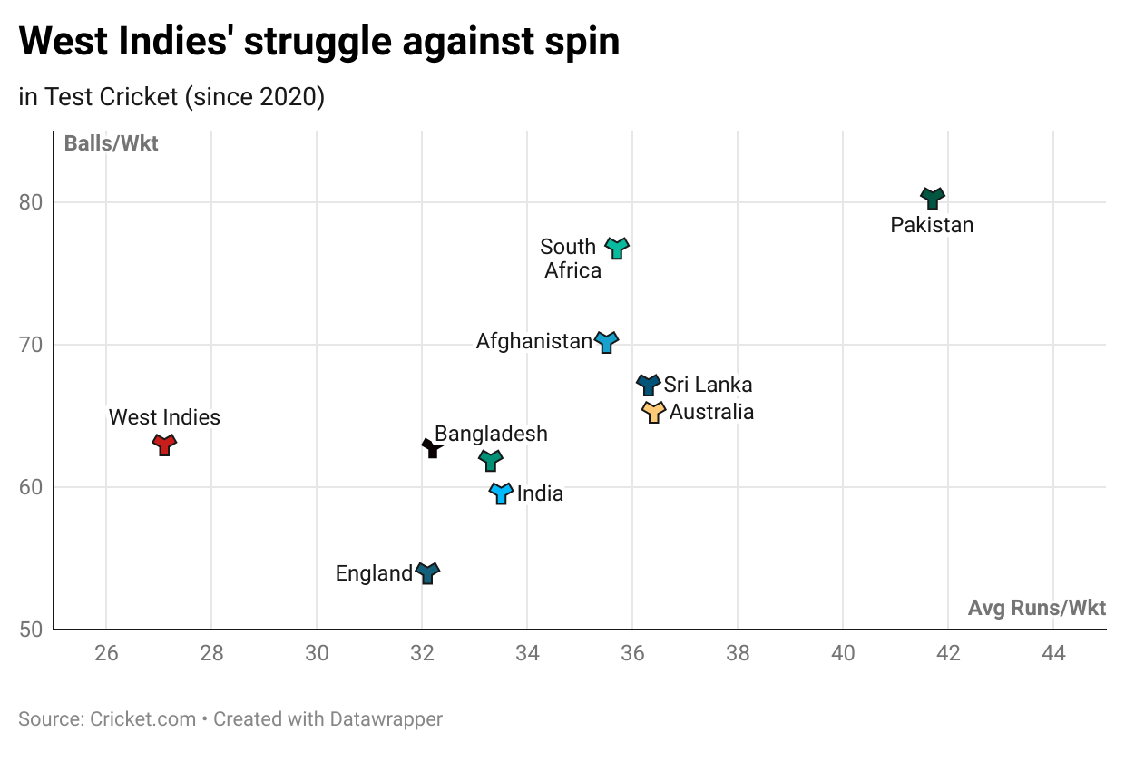 Since 2020, when Test cricket really was revolutionised by the advent of the World Test Championship (WTC), Windies cricket has suffered at the hands of spin. West Indies average the lowest - 27.1 - among the top ten Test-playing nations.