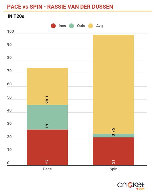 In the T20Is this year, Markram has amassed 139 runs in three innings at an average of 69.5 and a strike rate of 139 batting at number three compared to 130 runs in five innings at an average of 26 and a strike rate of 118 at number four. On the other hand, Rassie van der Dussen has struggled with the pace early in the innings and averages 28.1 against them compared to 75 against spin in T20s.
