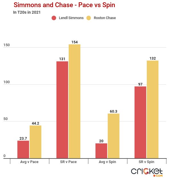 Lendl Simmons has endured a string of low scores in the last five matches in this form of the game. Barring a 72 against Australia, the right-handed batter has failed to notch up a substantial score for the side. To make things worse for him and the reigning champions, he has been striking at 131 against pace in the T20s and 97 against spin. With the sluggish wickets on offer, his struggle to take the attack to the spinners in the opposition bowling unit, especially in the powerplay, has caused plenty of trouble for the team.