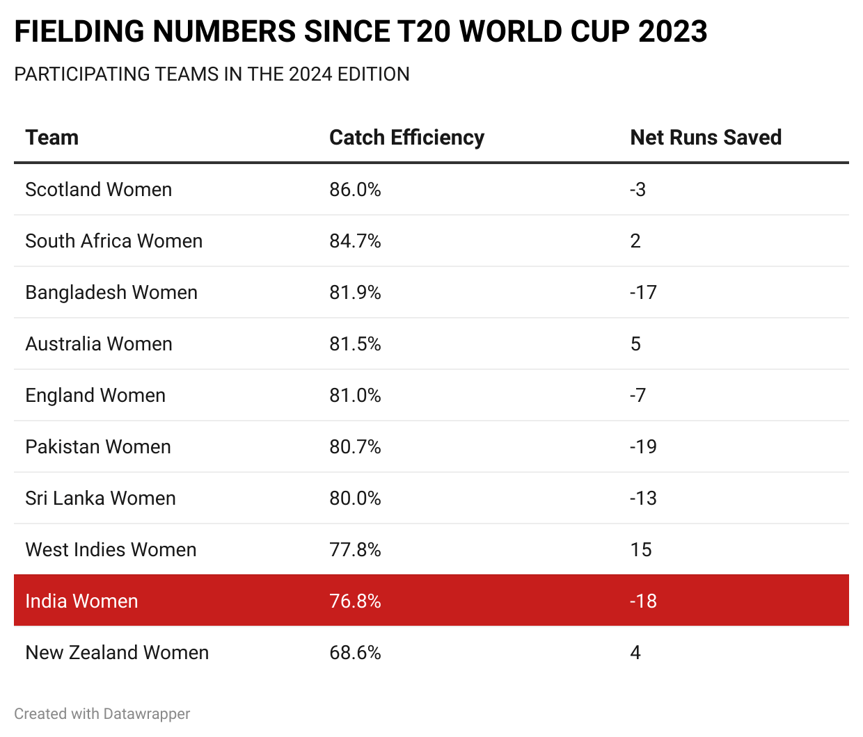 The numbers tell the story here. India have forgettable fielding numbers since the previous T20 World Cup in 2023. They are placed second from the bottom in catching efficiency and hold the same spot in terms of net runs saved.