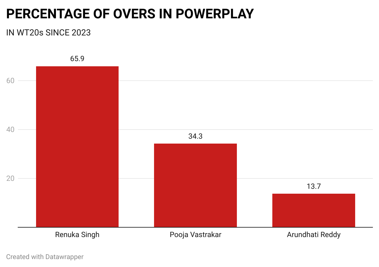 In all WT20s in 2024, she averages 43.3 runs per wicket at an economy of 7.2 in the powerplay. She had a poor WPL, picking only wicket in her 22 powerplay overs, conceding at 8.2 runs per over. The numbers have improved since that WPL season with seven wickets in 23 powerplay overs (average 20.9, economy 6.3) in nine WT20Is but not up to the mark if one is the sole player for the role.