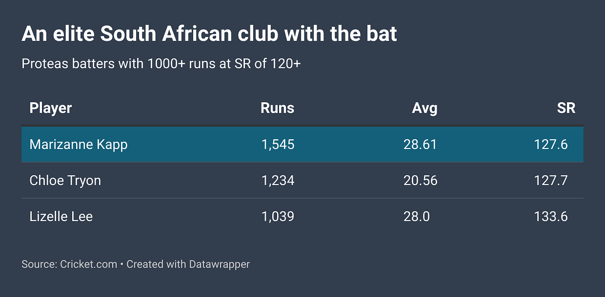 Since the start of 2023, Kapp has amassed 486 runs in the shortest format for the Proteas team; her strike rate of 131 is the third-best in the entire setup, behind Chloe Tyron and Annerie Derecksen, who have all been used as finishers in comparison to Kapp, who bats in the top four.