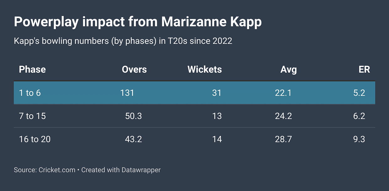 In the last three years, from a franchise cricket perspective, Kapp has primarily been used as a weapon of destruction in the powerplay, which shows in the wickets tally—31—while only giving runs at 5.2 per over. It is no shock that the franchises want to front-load her bowling when the field restrictions are in play, sheerly due to her ability to put the best of batters under immediate pressure.